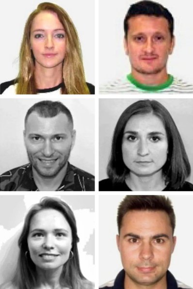 ستة من الجواسيس الروس، في اتجاه عقارب الساعة من أعلى اليسار؛ يكاترينا ليونيدوفنا دانيلوفا، وفلاديمير ألكساندروفيتش دانيلوف، وأولغا إيغوريفنا تيوتريفا، وألكسندر أندرييفيتش أوتيكين، وإيرينا ألكسيفنا أنتونوفا، ورومان أوليغوفيتش كوفال.