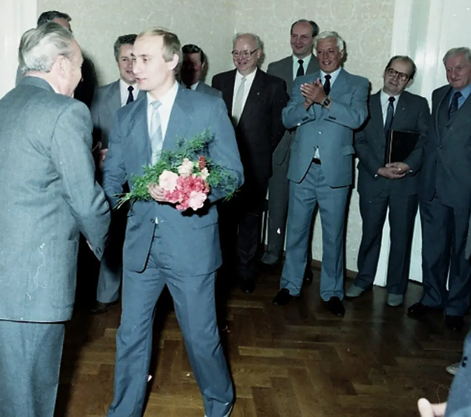 تظهر صورة من أواخر ثمانينيات القرن العشرين، قدمتها وكالة سجلات ستازي، فلاديمير بوتين، الثاني من اليسار، عندما كان يعمل في دريسدن، بألمانيا الشرقية، ضابطًا في جهاز المخابرات السوفيتية (كي جي بي) من عام 1985 إلى عام 1990.