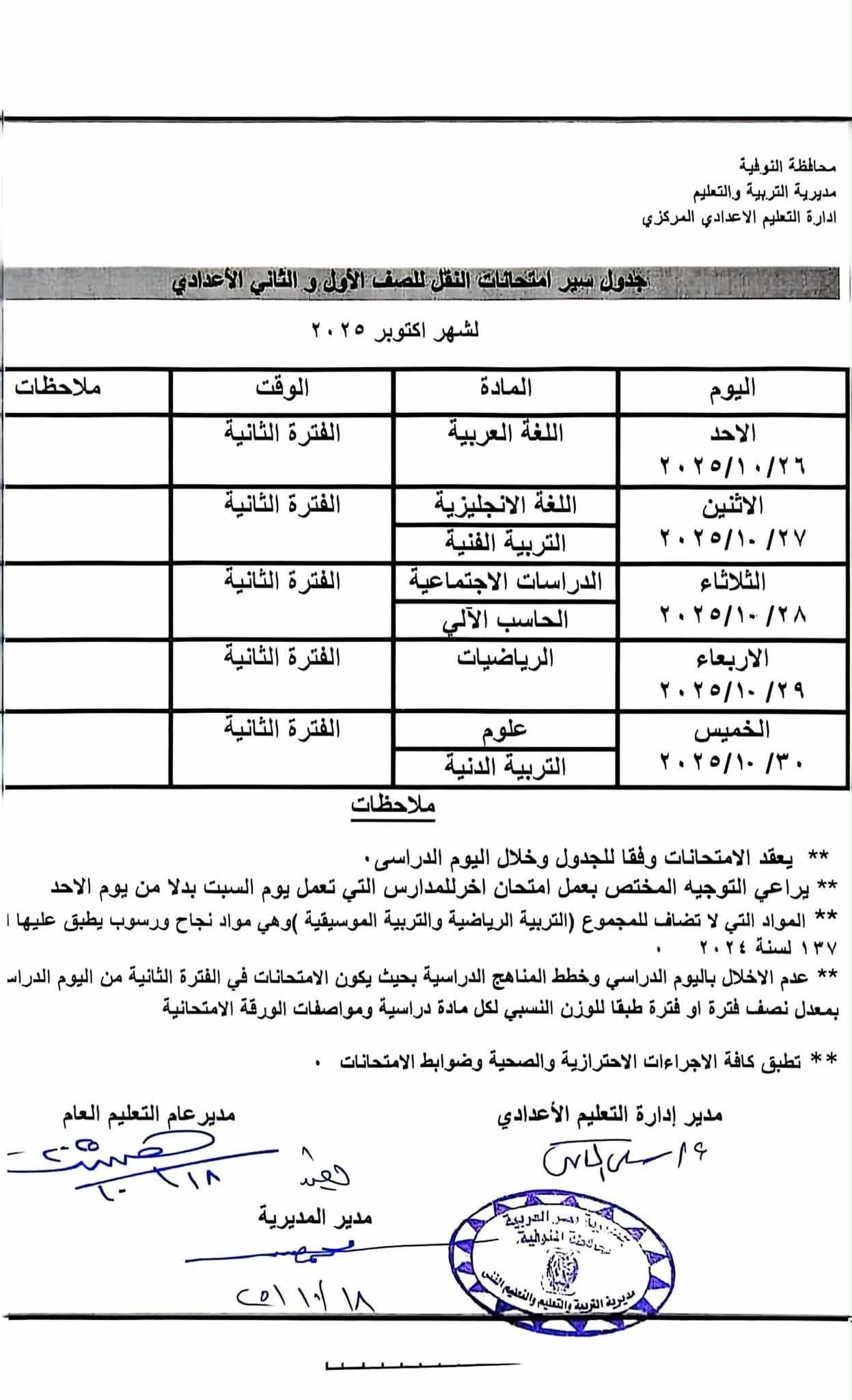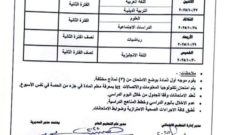 ودعت المديرية أولياء الأمور والطلاب إلى الاطلاع على الجدول المرفق للاستعداد الجيد للامتحانات وتحقيق أفضل النتائج.