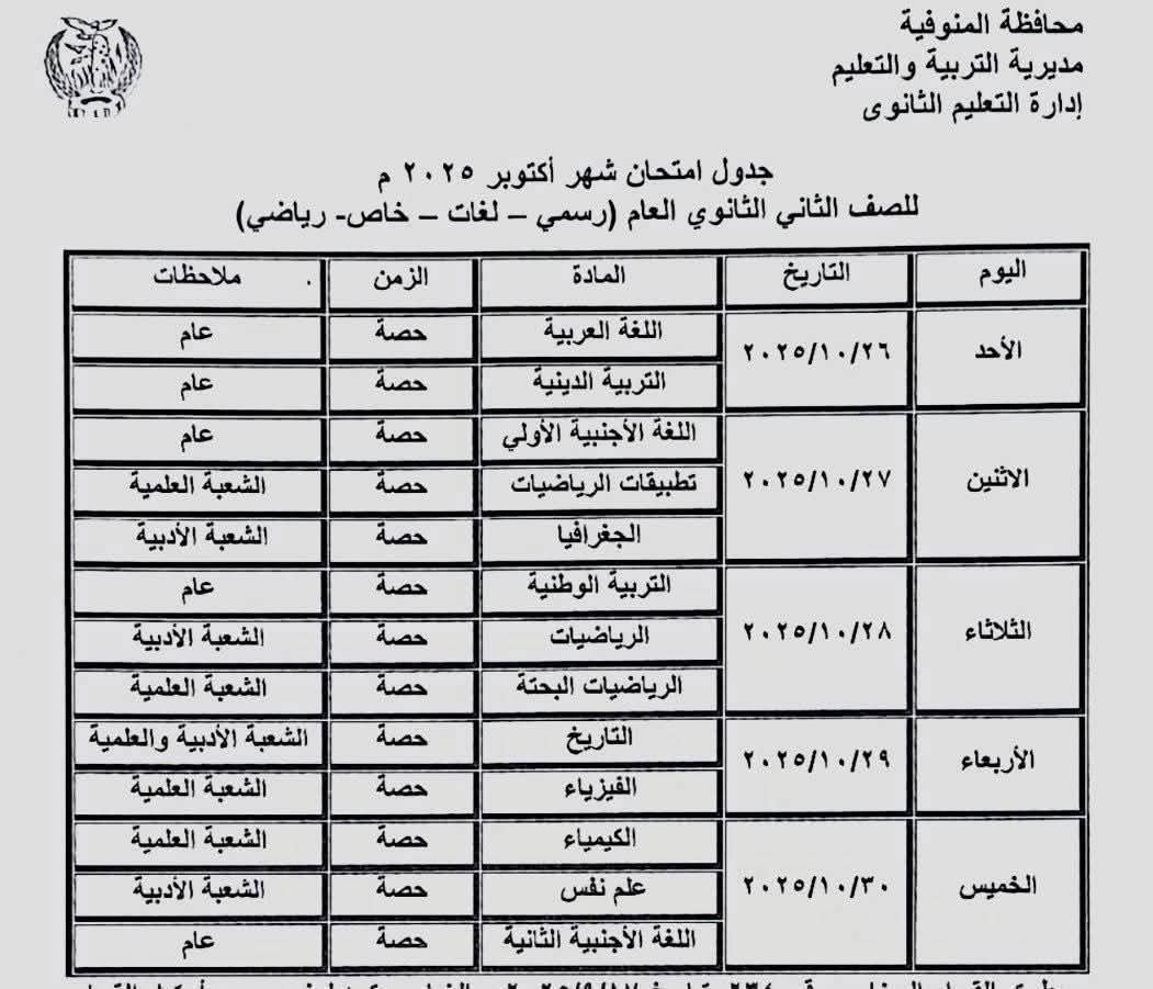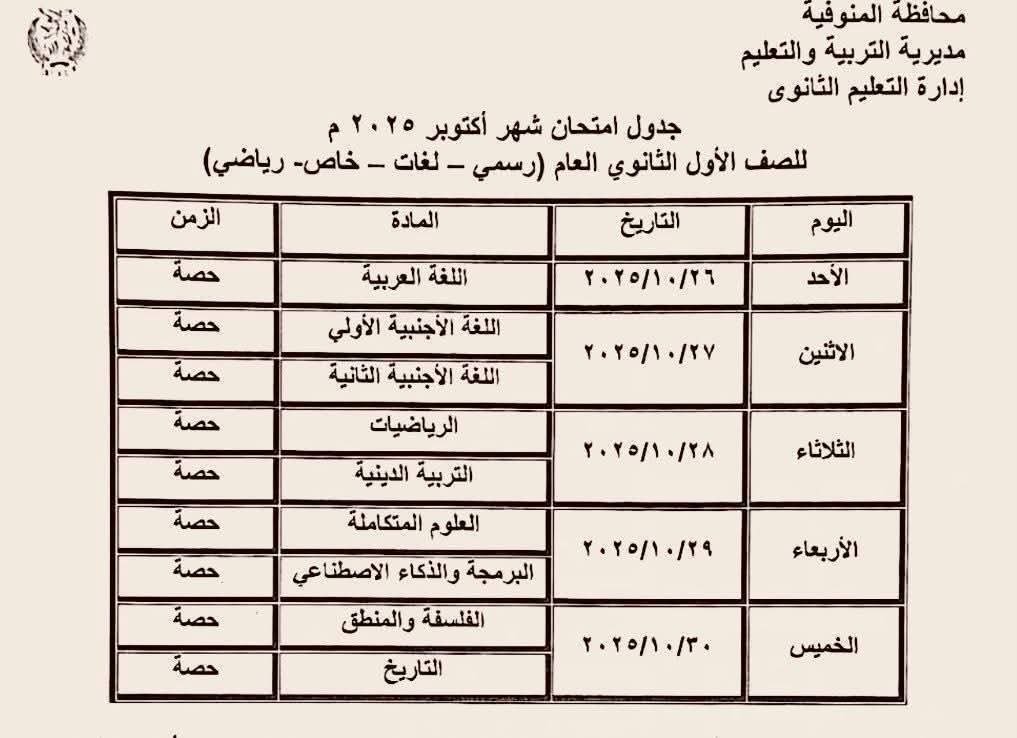 مديرية التعليم بالمنوفية تعلن جدول امتحانات أكتوبر للصف الثاني الثانوي
