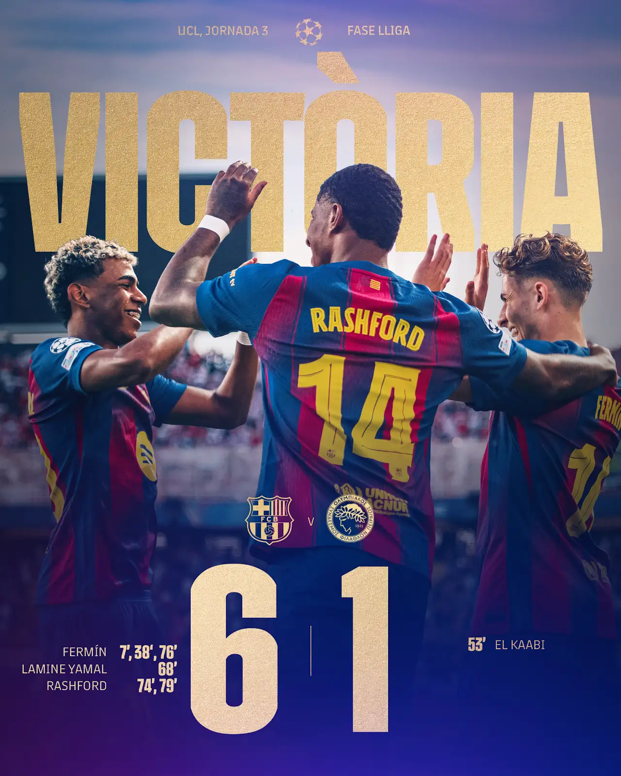 وفاز برشلونة علي مضيفه أولمبياكوس اليوناني بنتيجة ٦/١ في الجولة الثالثة من دورى أبطال أوروبا، وتعتبر هذا الإنتصار العريض هو أول إنتصار هذا الموسم بعد سلسلة من الإنتصارات العريضة في الموسم الماضي.