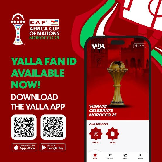 وأوضحت اللجنة في بيان رسمي، تمكن جماهير دول مصر وتونس وجنوب إفريقيا وزامبيا، من استعمال تطبيق “يال”، للحصول على بطاقة المشجع (Fan ID) وكذلك الحصول على التأشيرة الإلكترونية للسفر للمغرب (eVisa / AEVM) ، وهي خطوة أساسية قبل الحصول على تذاكر المباريات عبر التطبيق الرسمي لبيع التذاكر التابع للاتحاد الإفريقي لكرة القدم.