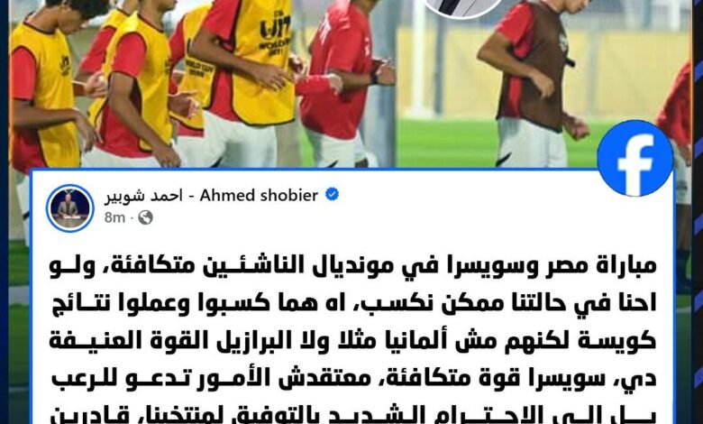 “مباراة مصر وسويسرا في مونديال الناشئين متكافئة، ولو احنا في حالتنا ممكن نكسب، لكن محتاجين نصدق نفسنا”، وهي كلمات عكست حجم الدعم الذي يقدمه للجهاز الفني واللاعبين في هذه المرحلة المهمة من البطولة.
