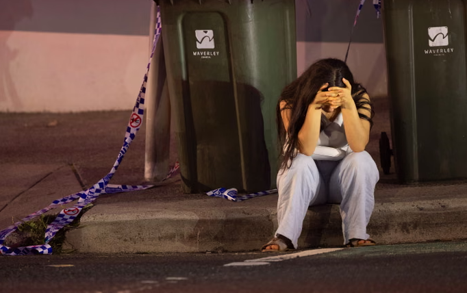 شابة تجلس في الشارع بعد إطلاق النار على شاطئ بوندي. صورة: جيسيكا هرومس/ذا جارديان