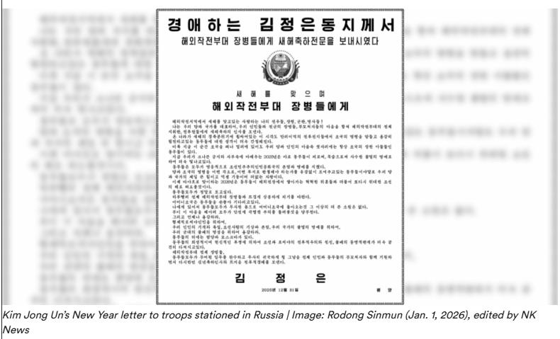 خلال احتفال رأس السنة في ملعب الأول من مايو في بيونغ يانغ، وجّه كيم جونغ أون “تحية نضالية” للجنود الكوريين الشماليين المنتشرين خارج البلاد، قائلًا إنهم يستقبلون العام الجديد بعيدًا عن الوطن لكن بقلوب “دافئة ومخلصة للأم”.