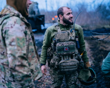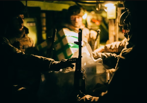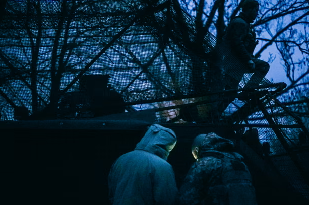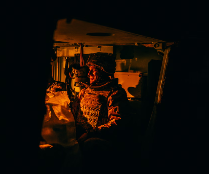 داخل الناقلة المدرعة، بالكاد تتسع المساحة للجنود ومعداتهم، لكن الروح المعنوية مرتفعة وممزوجة بتوتر خفي. يجيب أحدهم بابتسامة عندما يُسأل عن حالهم: «رائعون، رائعون». ومع اقتراب شروق الشمس، يصل الجنود إلى نقطة الإنزال ويستعدون لمسيرتهم الأخيرة نحو الخنادق.