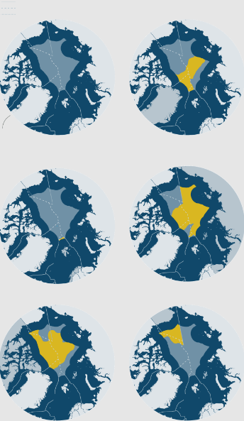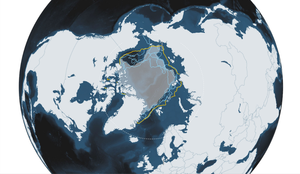 تشير البيانات الحديثة إلى تراجع غير مسبوق في مساحة الجليد البحري في القطب الشمالي، حيث انخفض متوسط الامتداد خلال السنوات الخمس الماضية بنسبة كبيرة مقارنة بعقود سابقة. هذا الانكماش الهائل يعادل فقدان مساحات بحجم دول كاملة، ما أدى إلى انكشاف بحار كانت مغلقة تمامًا أمام الملاحة. ومع غياب اليابسة عند القطب الشمالي نفسه، أصبحت مناطق واسعة من المحيط المتجمد الشمالي مفتوحة لأول مرة أمام الأنشطة البشرية. هذا التغير الجغرافي لا يعيد رسم الخرائط الطبيعية فقط، بل يفتح الباب أمام صراعات قانونية وسياسية حول السيادة والحقوق البحرية.