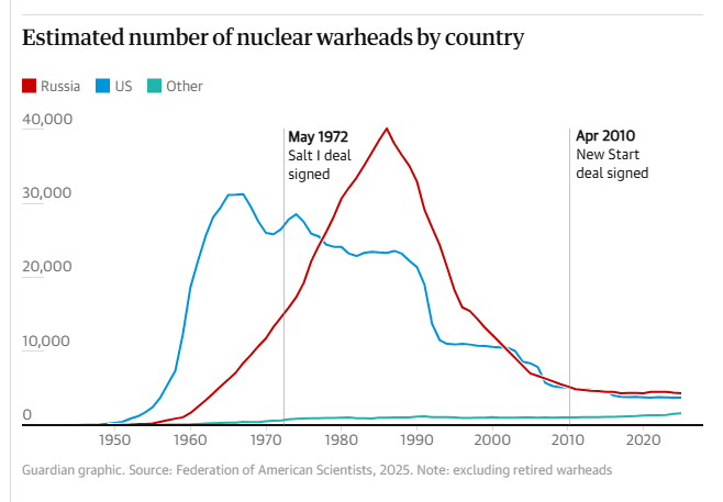 تنتهي معاهدة “نيو ستارت” التي وُقعت عام 2010 بين واشنطن وموسكو، لتزيل القيود التي كانت تحدد عدد الرؤوس النووية الاستراتيجية المنشورة عند 1550 رأسًا لكل طرف، إضافة إلى وضع سقف لعدد أنظمة الإطلاق مثل الصواريخ والقاذفات. وشكلت المعاهدة طوال سنواتها إطارًا رئيسيًا للحفاظ على توازن الردع النووي بين القوتين العظميين. ومع انتهاء الاتفاق، لن تبقى أي آلية قانونية تُلزم الطرفين بضبط حجم ترساناتهما النووية، ما يثير مخاوف من توسع سريع في برامج التسلح النووي لدى البلدين، خاصة في ظل التصعيد السياسي والعسكري المتزايد بينهما.