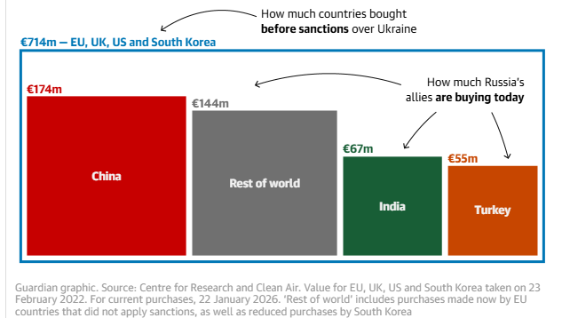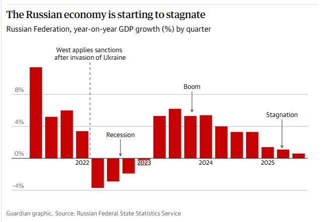 بدأت مؤشرات التباطؤ الاقتصادي تظهر بوضوح مع انخفاض أسعار النفط، التي تُعد مصدرًا رئيسيًا لتمويل الموازنة الروسية. وتشير تقديرات صندوق النقد الدولي إلى أن نمو الاقتصاد الروسي قد لا يتجاوز 0.8% خلال 2026، وهو من أضعف معدلات النمو منذ أزمة العقوبات التي أعقبت ضم شبه جزيرة القرم عام 2014. كما تراجعت مساهمة عائدات الوقود الأحفوري في الميزانية الروسية من نحو 40% في بداية الحرب إلى حوالي 25% خلال 2025، نتيجة انخفاض الأسعار وتشديد العقوبات وصعوبة إيجاد أسواق بديلة بنفس حجم السوق الأوروبية.