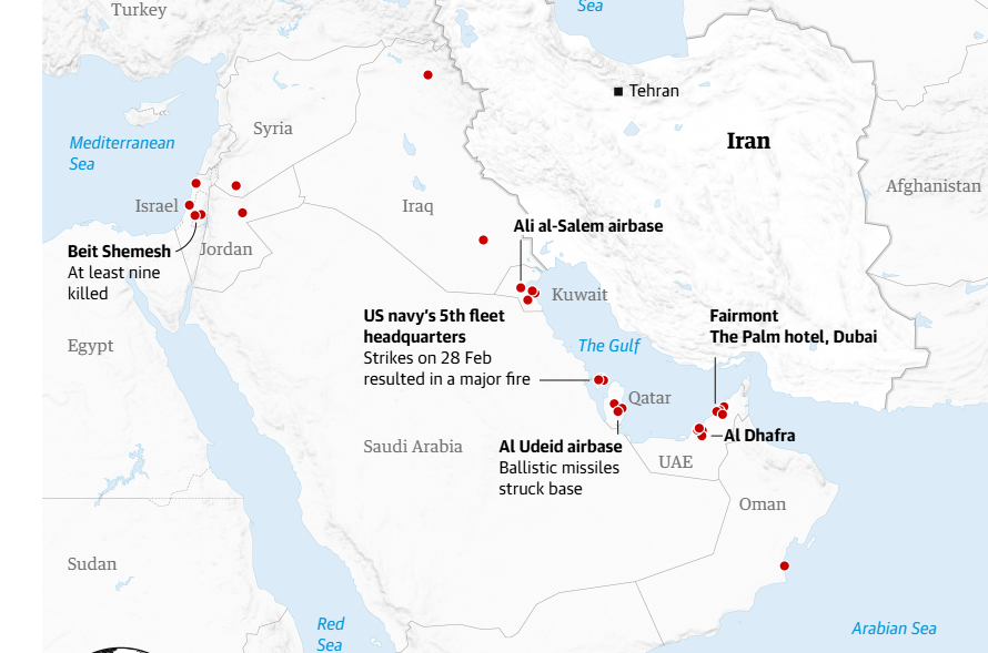 كما وسّعت إيران نطاق ردها إلى دول خليجية حليفة لواشنطن، مستهدفة مطارات ومنشآت في دبي والبحرين والكويت، إضافة إلى منشأة نفطية في رأس تنورة بالسعودية، حيث أعلنت الدفاعات الجوية إسقاط طائرات مسيّرة.