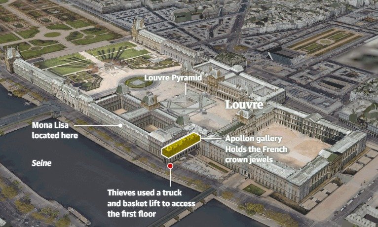 وأُغلق المتحف، وهو الأكثر زيارة في العالم، بشكل مفاجئ يوم الأحد بعد أن استهدفت السرقة قطعتين معروضتين داخل خزانتين زجاجيتين في قاعة أبولون (Apollon Gallery)، التي تُعرض فيها جواهر التاج الفرنسي.
