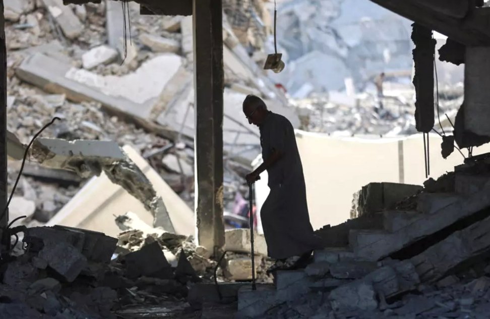 رجل مسن بين أنقاض مبنى في خان يونس جنوب غزة.