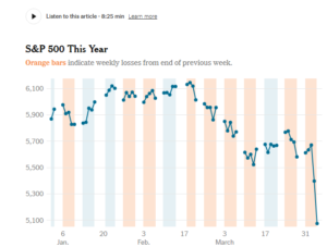 في تحول دراماتيكي للأسواق العالمية، انخفض مؤشر ستاندرد آند بورز 500 بنسبة 9.1% هذا الأسبوع، مسجلاً أسوأ أداء أسبوعي له منذ مارس 2020. وشهد يوم الجمعة وحده انخفاضًا بنسبة 6%، مما دفع المؤشر إلى الاقتراب من منطقة السوق الهابطة، بانخفاض إجمالي تجاوز 17% عن أعلى مستوياته في فبراير. وقد دخل مؤشرا ناسداك وراسل 2000 بالفعل مناطق السوق الهابطة، حيث سجل كلا المؤشرين خسائر تجاوزت 20%.وفقًا لصحيفة نيويورك تايمز