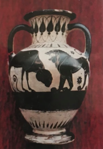 المزهرية، التي تعود إلى نحو عام 550 قبل الميلاد، من نوع “الأمفورا” وهي مزينة برموز أسطورية كأبي الهول والكبش والأسد. وقد نُسبت إلى فنان يُعرف بلقب “رسام فينيوس”، نسبةً إلى تصويره أسطورة الملك فينيوس على إحدى الأواني.