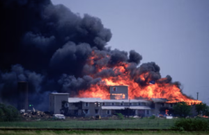 مجمع طائفة الداوديين في جبل الكرمل، خارج مدينة واكو، تكساس، احترق بالكامل خلال مداهمة مكتب الكحول والتبغ والأسلحة النارية عام ١٩٩٣. الصورة: جريجوري سميث/كوربيس عبر صور جيتي.